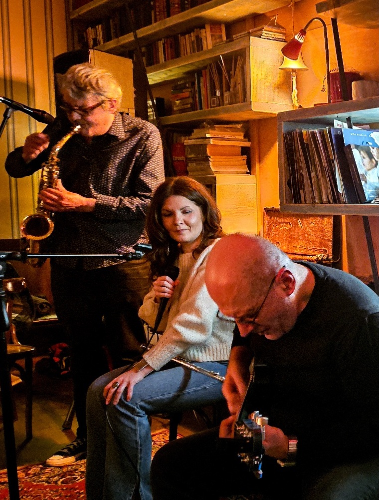 Jumătate din această cameră era ocupată de scaune așezate în trei șiruri, iar cealaltă jumătate fusese transformată în scenă. În spatele muzicienilor se aflau câteva rafturi formate din polițe zidite în perete, pline cu cărți, CD‑uri, casete, viniluri și alte obiecte vintage. Când am ajuns, camera era slab luminată, iar atmosfera – deja perfectă pentru un concert intim de jazz.