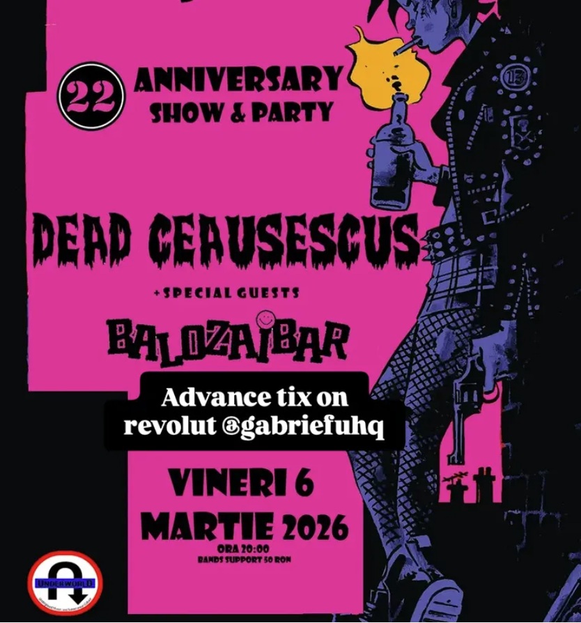 „Vineri, 6 martie 2026, aniversăm 22 de ani de Underworld cu un concert Dead Ceausescus și Balozaibar și un after-party ca pe vremuri! Free shot pentru toți participanții la eveniment!