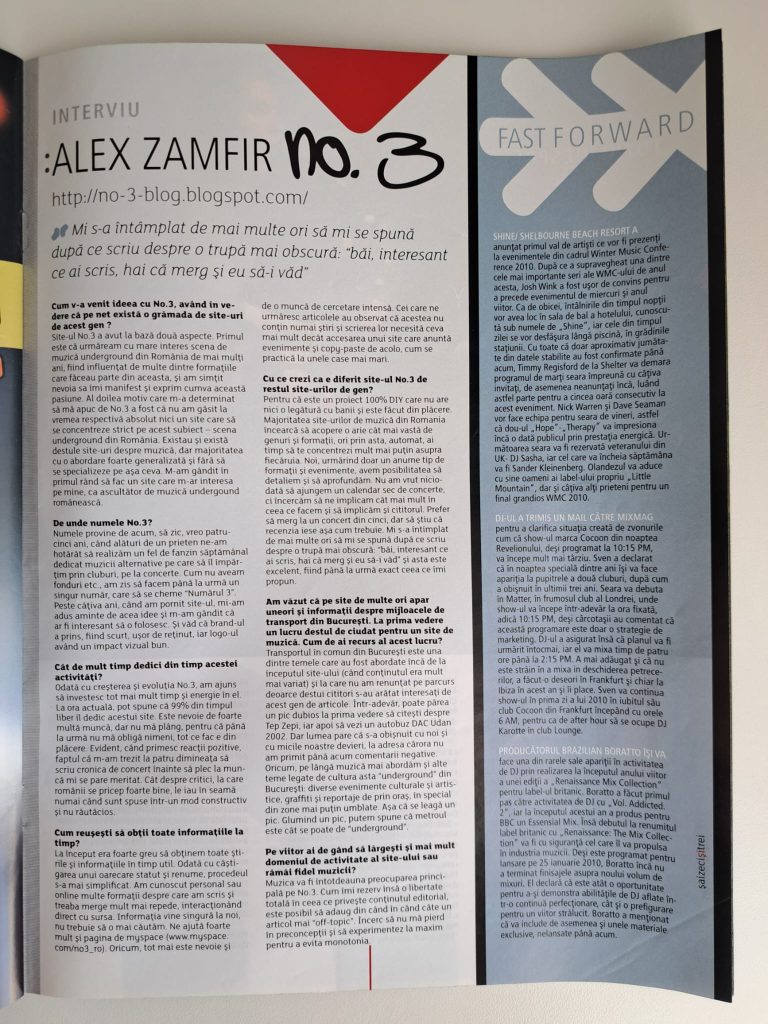Alex Zamfir: Site-ul No.3 a avut la bază două aspecte. Primul este că urmăream cu mare interes scena de muzică underground din România de mai mulți ani, fiind influențat de multe dintre formațiile care făceau parte din aceasta, și am simțit nevoia să îmi manifest şi exprim cumva această pasiune. Al doilea motiv care m-a determinat să mă apuc de No.3 a fost că nu am găsit la vremea respectivă absolut nici un site care să se concentreze strict pe acest subiect – scena underground din România. Existau şi există destule site-uri despre muzică, dar majoritatea cu o abordare foarte generalizată și fără să se specializeze pe așa ceva. M-am gândit în primul rând să fac un site care m-ar interesa pe mine, ca ascultător de muzică underground românească.